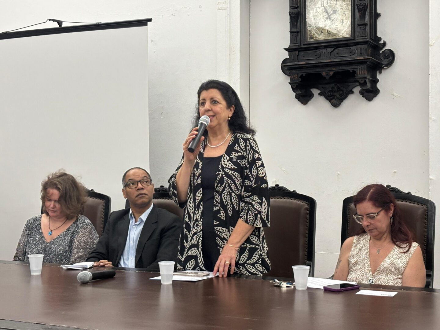 Também compuseram a mesa solene o decano do CFCH, Vantuil Pereira; a diretora do IH, Marta Mega; a vice-diretora do IH, Lise Fernanda Sedrez; e a presidente da Coordenação de Aperfeiçoamento de Pessoal de Nível Superior (Capes), Denise Pires de Carvalho. Eles apontaram a importância histórica e simbólica do Instituto de História, lembrando que sua criação representou mais do que uma mudança administrativa, mas a consolidação de um projeto coletivo construído ao longo de décadas. Destacaram ainda o protagonismo da graduação, o fortalecimento da pesquisa e da pós-graduação, além do papel central do instituto na formação de professores e historiadores.